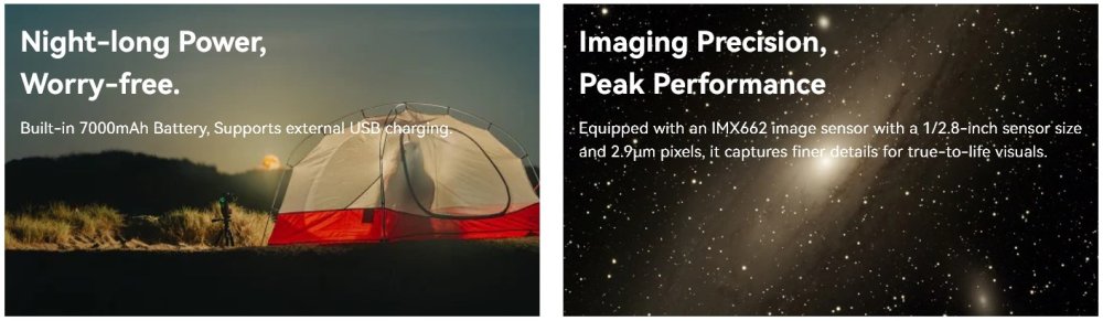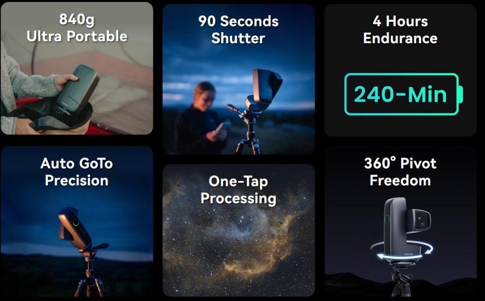 Prozkoumejte vesmír během několika minut. Automaticky se kalibruje, vyhledá vybrané objekty a přesně je udrží v záběru. Snadno zachytíte dechberoucí detaily měsíčních kráterů, vzdálených galaxií, zářících mlhovin a v širokoúhlém záběru i naší Mléčné dráhy.