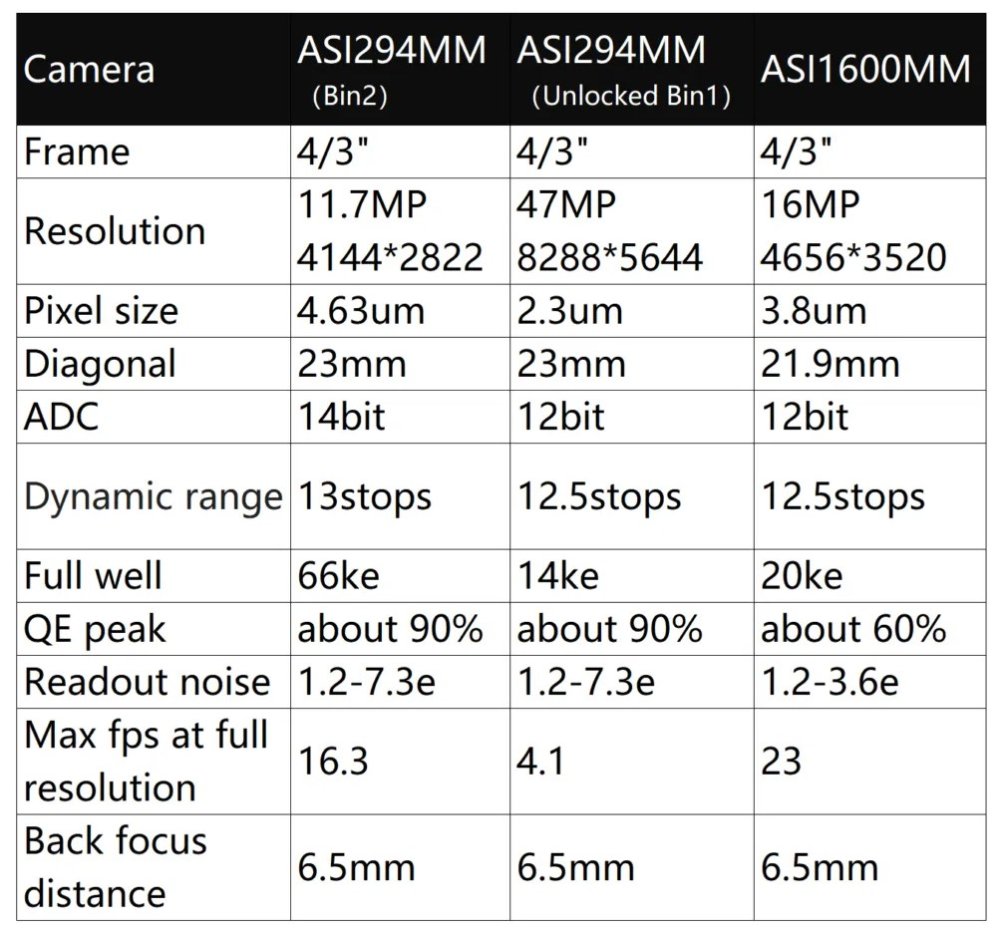 Další výhodou kamery ASI294MM je možnost přepínání velikosti pixelů – v softwaru pro astrofotografii můžete kdykoli přepínat mezi odemčeným režimem Bin1 a režimem Bin2. Režim odemčeného Bin1 mění velikost pixelů na 2,3 um a zvyšuje rozlišení na 8288 × 5644. Možnost odemknout režim bin1 byla častým požadavkem zákazníků.