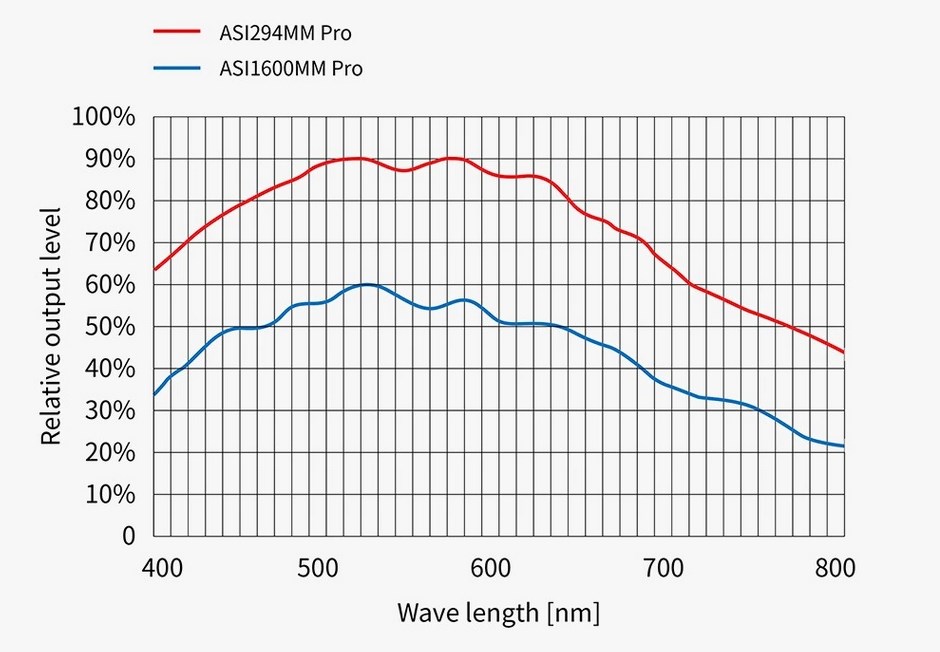 Jako nejnovější monochromatická kamera BSI (typ s osvětlením ze zadní strany) od společnosti ZWO má ASI294MM velmi vysoký výkon QE, který je vyšší nejen než u její barevné verze, ale dokonce i než u ASI1600MM. Odhaduje se, že špičková hodnota QE je přibližně 90 %.