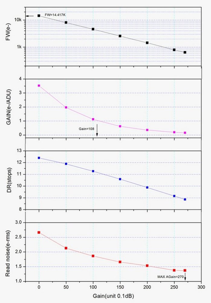 - Bin2: 14bitový ADC, velikost pixelu 4,6μm , 11,7 megapixelů, rozlišení 4144*2822, kapacita full well 66k.