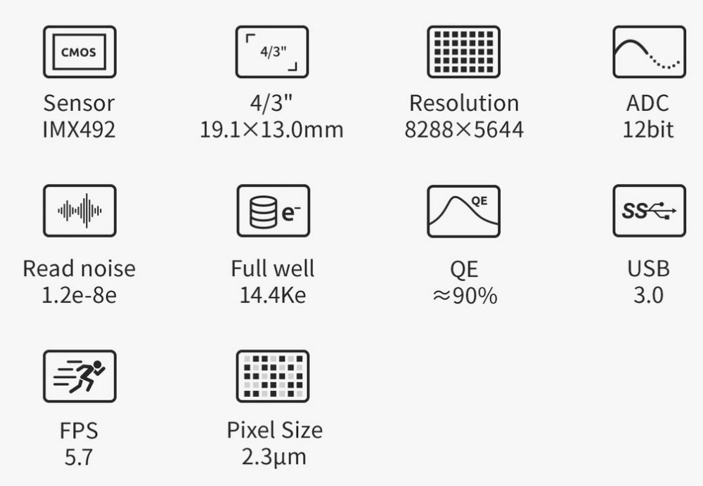 - Formát 4/3” s velikostí pixelu 4,64 um – ideální pro mnoho typů dalekohledů.