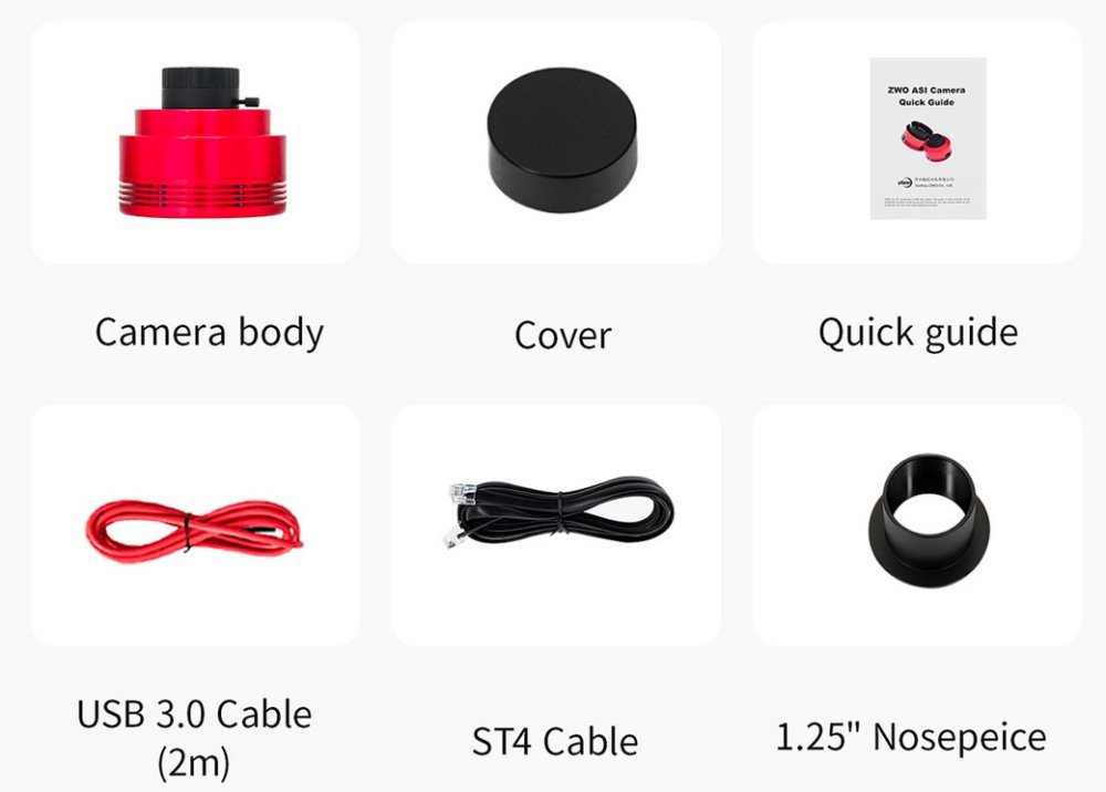 kamera, krytka, 1,25" adapter, ST4 kabel, USB3.0 kabel (2m), návod