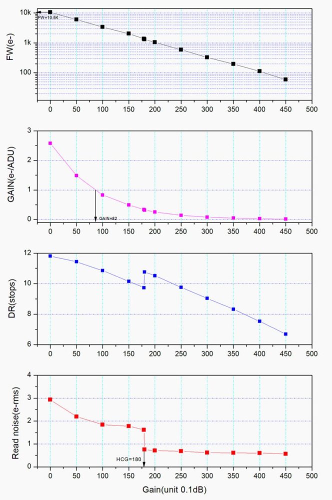 Kamera využívá režim HCG, ve kterém efektivně redukuje čtecí šum při vysokém zisku, což kameře umožňuje udržet stejný vysoký dynamický rozsah jako při nízkém zisku. HCG režim se automaticky aktivuje po dosažení zisku na úrovni 188. Čtecí šum je na velmi nízké úrovni 0,56e- a přesto dynamický rozsah dosahuje úrovně blízkou 11 bitům.