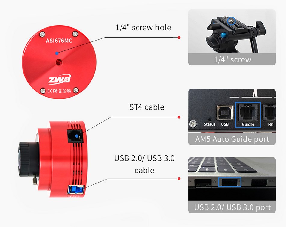 Astro kamera ZWO ASI676MC USB3.0 je barevná OSC (one shot color) kamera s pasivním vzduchovým chlazením a velmi nízkým šumem, určená spíše pokročilejším uživatelům. Kamera je osazená 1/1.6" barevným snímačem Sony IMX676 z nejnovější generace s excelentní citlivostí na vlnové délky poblíž infračerveného spektra.