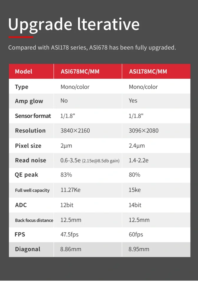 Planetární kamera ZWO ASI 678 MM je považována za upgrade kamery ASI 178 MM. Obsahuje nejnovější snímač Sony IMX678 s pokročilou technologií STARVIS 2. Ve srovnání s ASI 178 MM je tato kamera prakticky bez osvitu z pomocných obvodů (amp-glow), má nižší čtecí šum a vyšší citlivost. Také je výrazně zredukován šum temného proudu (dark current noise) a výkon čidla v oblasti blízké IR spektru je významně lepší.