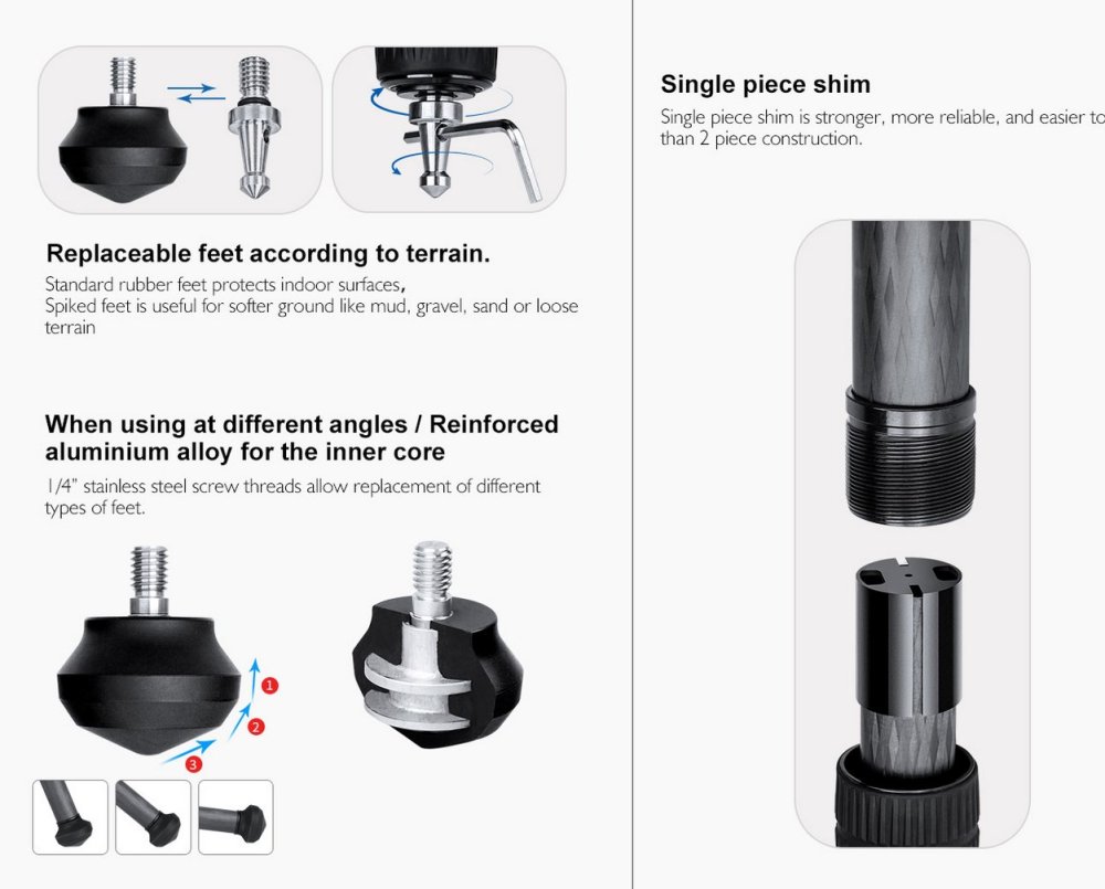 Výměnné koncovky nohou umožní použití stativu na různých površích.