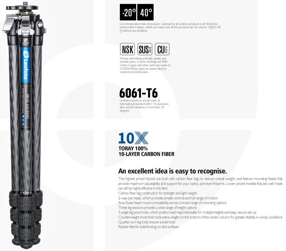 Leofoto - karbonový stativ Mr.O LO-224C + BV-1R (3kg/170cm)