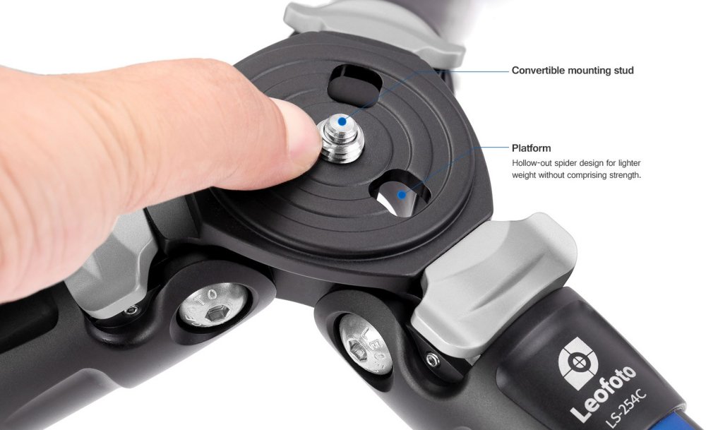 Kompaktní design bez středového otvoru pro sloupek. Sloupek se upevní na horní stativový šroub 3/8". Nízká hmotnost a kompaktní rozměry.