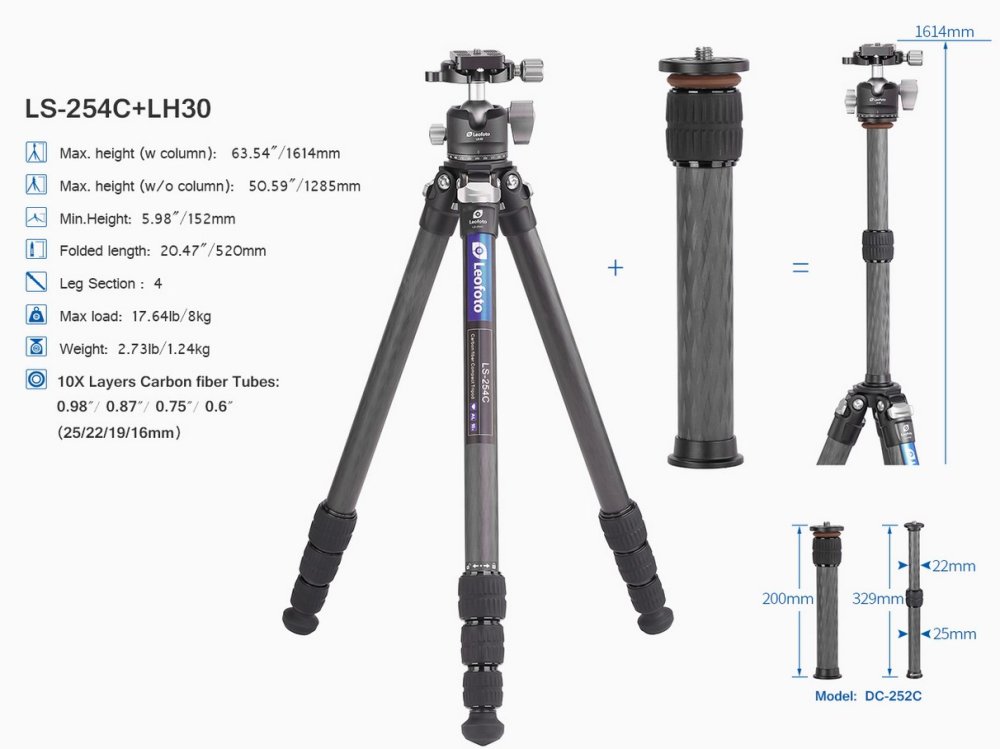 Včetně kulové hlavy Leofoto LH-30, stativové destičky typu Arca-Swiss s 1/4" šroubem.