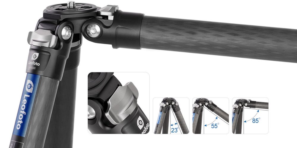 Poloautomatický systém zarážek nastavení sklonu nohou stativu.