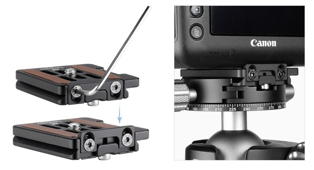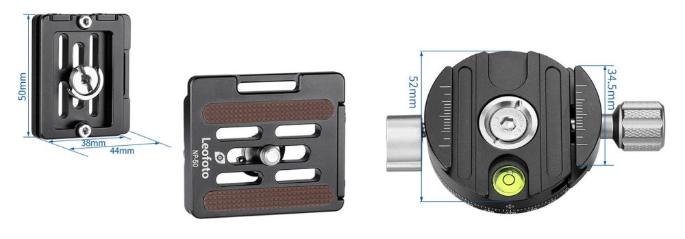 Destička typu Arca-Swiss NP-50 s možností nastavení dorazu je osazená 1/4" fotošroubem. Panoramatická deska o má svorkový aretační mechanismus ovládaný přítlačným šroubem, který zajistí pevné upnutí přísroje (foto, video nebo dalekohledu).
