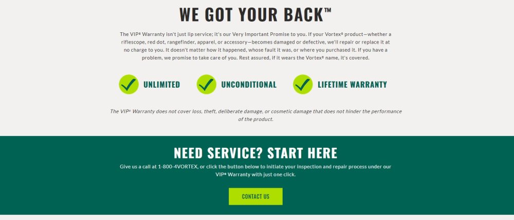 Americká firma Vortex Optics poskytuje na veškeré své dalekohledy a puškohledy doživotní bezpodmínečnou VIP (Very Important Promise) záruku na funkčnost výrobku. Firmě Vortex jde především o spokojeného zákazníka. Navíc svým výrobkům důvěřuje natolik, že si dovolí udělit neomezenou VIP záruku.
